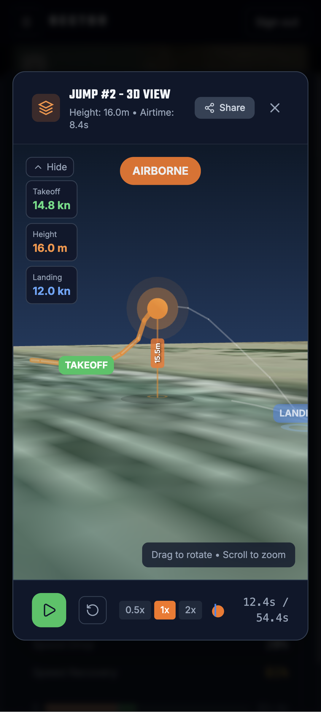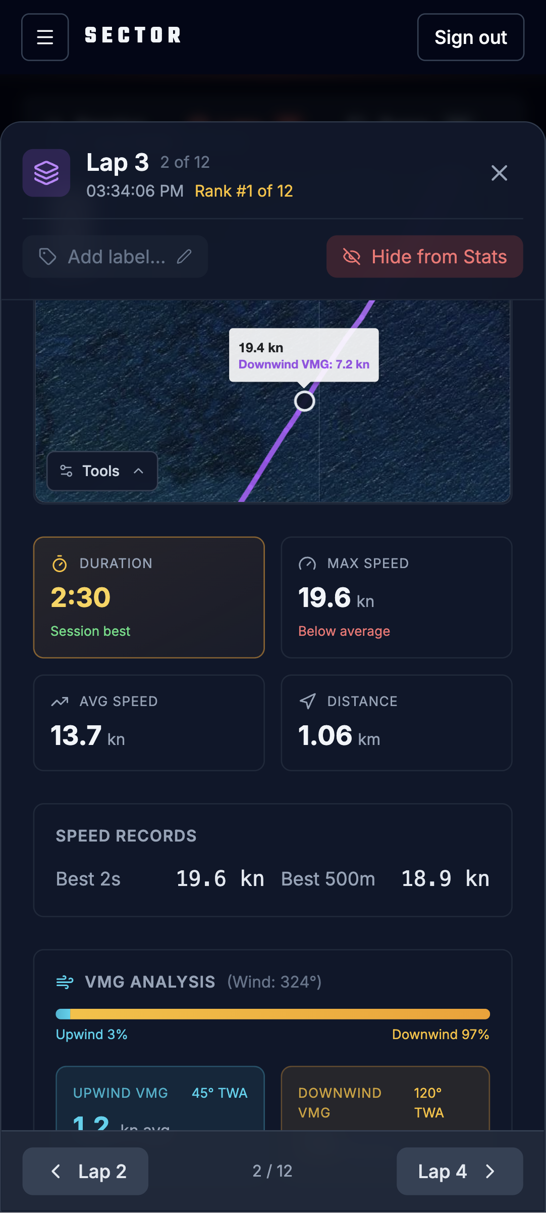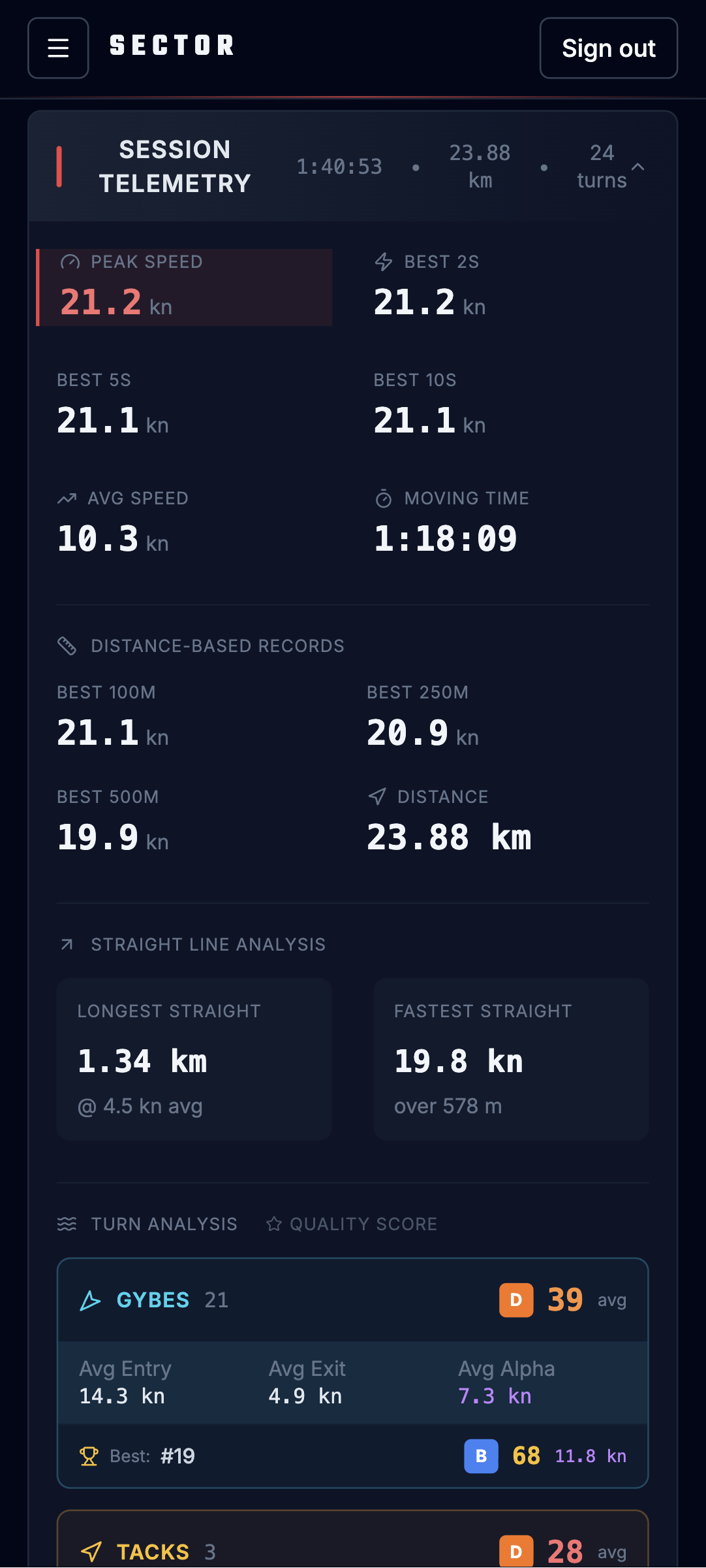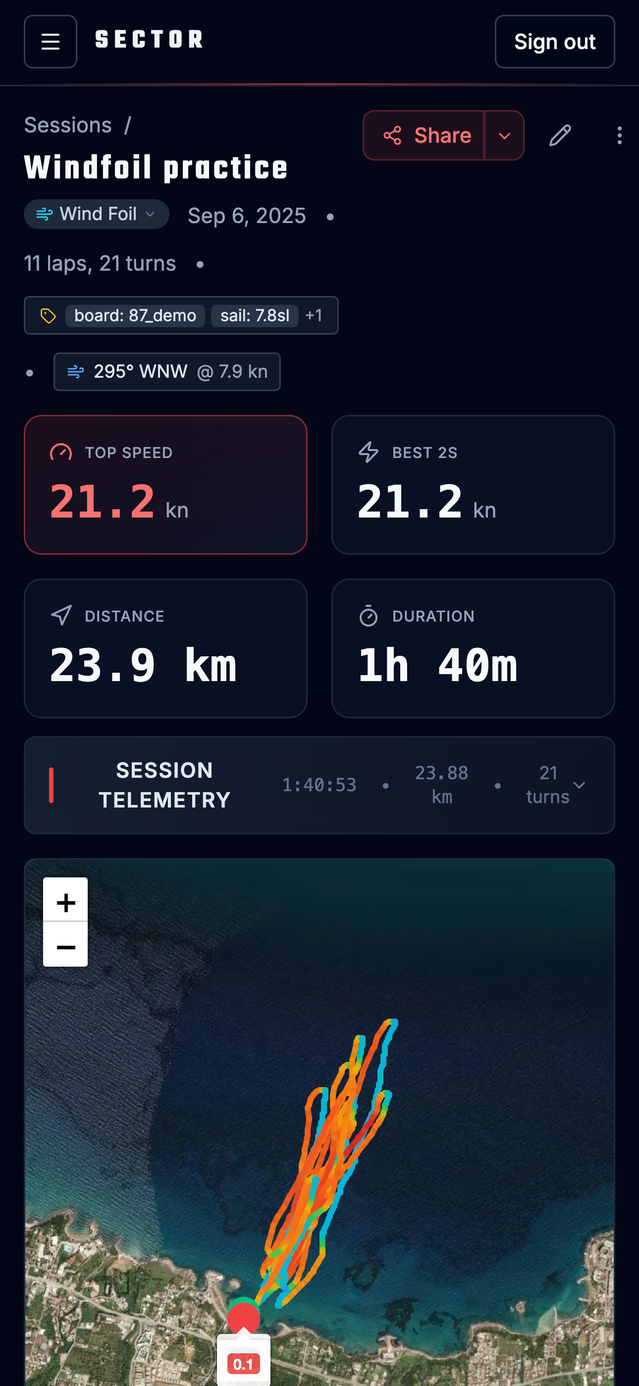 Every session hits different. Top speed, total distance, wind conditions, and your full GPS track — served up instantly so you know exactly how you performed.
